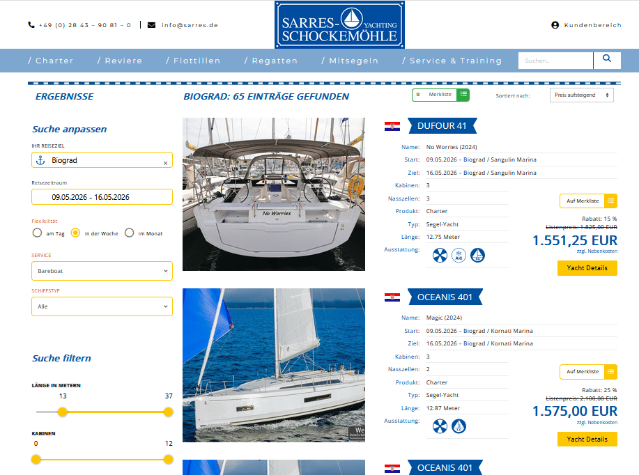 Unser erfahrenes Team berät Sie gerne persönlich und unterstützt Sie bei der Wahl der passenden Yacht und des optimalen Reviers. Oder stöbern Sie einfach durch unsere tagesaktuelle Online-Yachtsuche unter www.sarres.de und entdecken Sie Ihr nächstes Charterabenteuer.