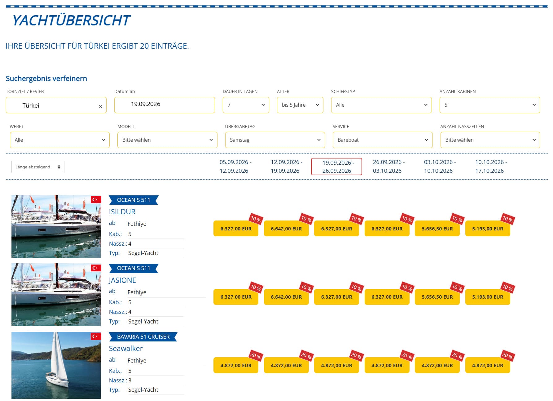 Neben Revier, Yachtgröße und Kabinenanzahl stehen hier besonders die Preis-, Wochen- und Vakanzübersicht im Vordergrund – so behalten Sie jederzeit den besten Überblick und finden die Yacht, die optimal zu Ihren Plänen passt.